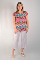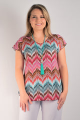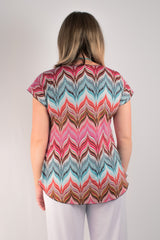 A stylish take on a classic women's tee, the Taj Print short sleeve shirt is designed to freshen up your wardrobe. This gorgeous print features pink and green tones in a stylish chevron pattern. Made with a soft jersey fabric, our Splash top is tailored with a figure-flattering swing cut, curved hemline, and a cap sleeve to ensure you feel cool and comfortable all day long. We love the way this flattering v-neck top looks paired with palazzo pants, capris, or your favourite pair of denim jeans. Plus, it's versatile enough to wear for work, travel, or every day.