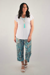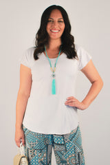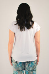 This white microfibre short sleeve top is classic, comfortable and ultra stylish. Designed to flatter your figure, the Paradise Island top is undeniably well cut and hides a multitude of sins. Handcrafted with a swing cut, curved hem, and cap sleeves, this lightweight jersey top offers superior softness, making it easy to wear and comfy all day long. It is an essential piece for work, weekends or travel, that can be paired with a multitude of items, including your favourite jeans, palazzo pants, or classic capris. Not to mention, it can be easily layered beneath a kimono or cardigan for cooler seasons.