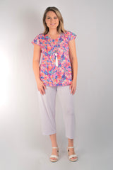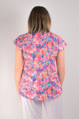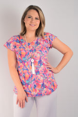 A stylish take on a classic women's tee, the Floss Print short sleeve shirt is designed to freshen up your wardrobe. This gorgeous print features pink, blue & purple colours in a stylish floral pattern. Made with a soft jersey fabric, our Splash top is tailored with a figure-flattering swing cut, curved hemline, and a cap sleeve to ensure you feel cool and comfortable all day long. We love the way this flattering v-neck top looks paired with palazzo pants, capris, or your favourite pair of denim jeans. Plus, it's versatile enough to wear for work, travel, or every day.