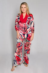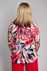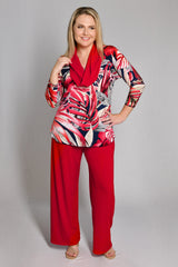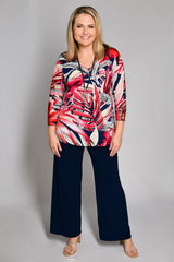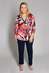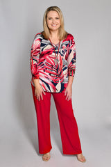 Upgrade your casual style with this 3/4 sleeve top which features our Magnolia print. This gorgeous print combines red, navy and white tones in a stylish leafy pattern. Designed using a soft and breathable jersey knit fabric for a relaxed and comfortable fit, this women’s Magnolia print top is easy to wear with palazzo pants, jeans, leggings, or a classic capri. You'll love the fit of the magyar cut sleeve, attractive v neck and curved hemline— it’s the perfect top for creating fashionable layers this season!