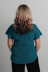 A dressy take on a classic women's tee, our Aqua sparkle short sleeve shirt is designed for special occasions and is new to our Glitz and Glam collection. Made with a soft jersey fabric, this top is tailored with a figure-flattering swing cut, curved hemline, and a longer sleeve to ensure you feel cool and comfortable all day long. We love the way this flattering v-neck top looks paired with matching palazzo pants and add a shimmery necklace or matching cowl neck scarf, to make it the perfect top for a wedding, evening event or special occasion.