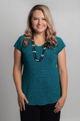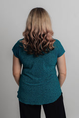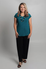 A dressy take on a classic women's tee, our Aqua sparkle short sleeve shirt is designed for special occasions and is new to our Glitz and Glam collection. Made with a soft jersey fabric, this top is tailored with a figure-flattering swing cut, curved hemline, and a cap sleeve to ensure you feel cool and comfortable all day (and night) long. We love the way this flattering v-neck top looks paired with matching palazzo pants and add a shimmery necklace or matching cowl neck scarf, to make it the perfect top for a wedding, evening event or special occasion.