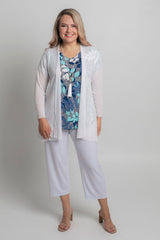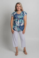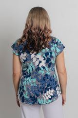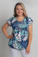 A stylish take on a classic women's tee, the Azure Print short sleeve shirt is designed to freshen up your wardrobe. This gorgeous print combines blue shades with navy and white in a stylish leafy pattern. Also features some raised white texture highlights. Made with a soft jersey fabric, our Azure top is tailored with a figure-flattering swing cut, curved hemline, and a cap sleeve to ensure you feel cool and comfortable all day long. We love the way this flattering v-neck top looks paired with palazzo pants, capris, or your favourite pair of denim jeans. Plus, it's versatile enough to wear for work, travel, or every day.