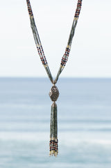 Every fashionable lady needs a piece of head-turning jewelry to complete her outfit-- and this Burmese Jade necklace is designed to do just that! Handcrafted with tan, black and jade beads and a carved silver pendant, this long necklace can be worn as a statement piece or layered with multiple colours for a more relaxed look. Plus, it looks great over your favorite cami, dressy top, or a classy shift dress.