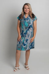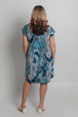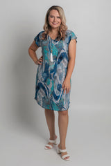 Easy, effortless, and essential - our Cascade Print short sleeve shift dress is destined to be your go-to outfit for every occasion. It features blue, white, aqua and beige colours in a stylish abstract pattern. Made from a soft, jersey fabric for breathability and comfort, this printed knee length dress is hand-tailored with an a-line silhouette, curved hem, and features flattering cap sleeves that never restrict your arms or hold in heat. Add sneakers or sandals for a fun daytime look or dress it up for evenings or special events.