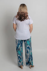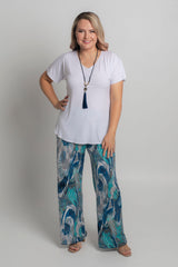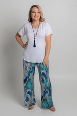 These versatile palazzo pants offer a stylish, straight leg look that can be dressed up or down. The gorgeous Cascade print features blue, white, aqua and beige colours in a stylish abstract pattern. Designed without a side seam for a more flattering shape, these lightweight pants will give you a sleek look that is comfortable and chic.