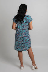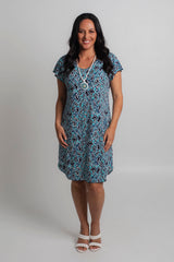 Easy, effortless, and essential - our Cosmos Print short sleeve shift dress is destined to be your go-to outfit for every occasion. It features aqua, navy, blue and white colours in a stylish modern pattern. Made from a soft, jersey fabric for breathability and comfort, this printed knee length dress is hand-tailored with an a-line silhouette, curved hem, and features flattering cap sleeves that never restrict your arms or hold in heat. Add sneakers or sandals for a fun daytime look or dress it up for evenings or special events.