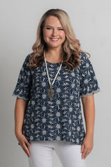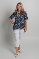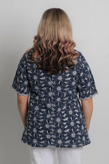 Set your sights on this fashionable and figure flattering swing shirt in our 100% cotton Daisy Navy/White fabric. It's the perfect top for work, weekends or that special occasion. Made with cool cotton, this classic shirt is thoughtfully designed with a tailored elbow length sleeve, shaped hemline and attractive round neck. With feature embroidered eyelets througout, this summer-loving fabric is like wearable air-conditioning. The versatile design is comfortable, classy, and easy to dress up with capri pants or dress down with your favourite pair of denim jeans.