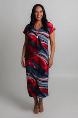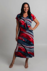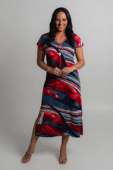 Effortless style meets all day comfort thanks to our Dallas Print jersey maxi dress. The gorgeous Dallas print features red, navy and white in a stylish abstract painterly pattern. This style can easily be dressed up with sandals and a shimmery necklace making it the perfect outfit for a summer wedding, day at the beach, or night out with friends.