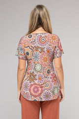 A stylish take on a classic women's tee, this Doily printed longer sleeve shirt is designed to brighten up your wardrobe. Made with a soft jersey fabric, this top is tailored with a figure-flattering swing cut, curved hemline, and a longer sleeve to ensure you feel cool and comfortable all day long. We love the way this flattering v-neck top looks paired with palazzo pants, capris, or your favourite pair of denim jeans. Plus, it's versatile enough to wear for work, travel, or every day.