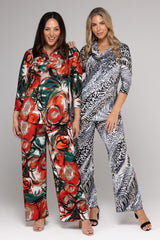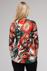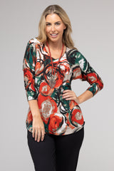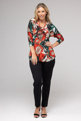 Upgrade your casual style with this 3/4 sleeve top which features our Fire print. This gorgeous print combines red, green, black and white colours in a stylish pattern. Designed using a soft and breathable jersey knit fabric for a relaxed and comfortable fit, this women’s Cascade print top is easy to wear with palazzo pants, jeans, leggings, or a classic capri. You'll love the fit of the magyar cut sleeve, attractive v neck and curved hemline— it’s the perfect top for creating fashionable layers this season!
