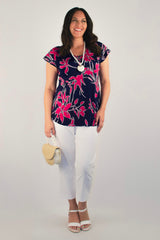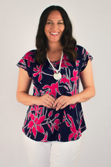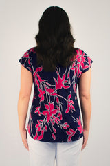 A stylish take on a classic women's tee, the Hot Print short sleeve shirt is designed to freshen up your wardrobe. This gorgeous print features navy and hot pink colours in a stylish floral pattern. Made with a soft jersey fabric, our Hot top is tailored with a figure-flattering swing cut, curved hemline, and a cap sleeve to ensure you feel cool and comfortable all day long. We love the way this flattering v-neck top looks paired with palazzo pants, capris, or your favourite pair of denim jeans. Plus, it's versatile enough to wear for work, travel, or every day.