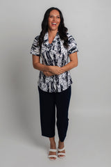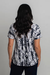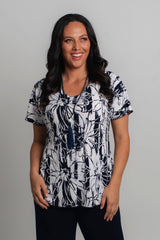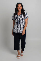 A stylish take on a classic women's tee, this Marine print longer sleeve shirt is designed to style up your wardrobe. Made with a soft jersey fabric, this top is tailored with a figure-flattering swing cut, curved hemline, and a longer sleeve to ensure you feel cool and comfortable all day long. We love the way this flattering v-neck top looks paired with palazzo pants, capris, or your favourite pair of denim jeans. Plus, it's versatile enough to wear for work, travel, or every day.