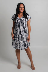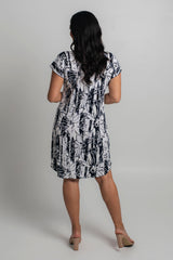 Easy, effortless, and essential - our Marine Print short sleeve shift dress is destined to be your go-to outfit for every occasion. It features navy and white in a stylish modern floral pattern, and also features some raised white texture highlights. Made from a soft, jersey fabric for breathability and comfort, this printed knee length dress is hand-tailored with an a-line silhouette, curved hem, and features flattering cap sleeves that never restrict your arms or hold in heat. Add sneakers or sandals for a fun daytime look or dress it up for evenings or special events.