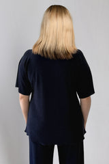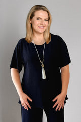 A dressed-up take on a classic women's tee, this Midnight blue longer sleeve sparkle top is designed to style up your special occasion wardrobe and is new to our Glitz and Glam collection. Made with a soft jersey fabric, this top is tailored with a figure-flattering swing cut, curved hemline, and a longer sleeve to ensure you feel cool and comfortable all day long. We love the way this flattering top looks paired with palazzo pants and add a shimmery necklace or matching cowl neck scarf to make the perfect top for a wedding, evening event or special occasion.