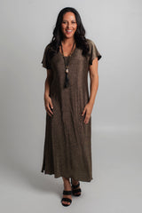 Effortless style meets all day comfort thanks to our Moet dark gold sparkle jersey maxi dress, new to our Glitz and Glam collection. This style can easily be dressed up with heels and a shimmery necklace or matching cowl neck scarf, making it the perfect outfit for a wedding, evening event or special occasion.