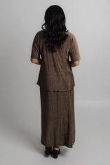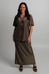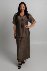 Shimmer your way through the cooler months in our Moet Dark Gold Sparkle Jersey Long Straight Skirt, part of the dazzling Glitz and Glam collection. Crafted from soft, comfortable jersey with a subtle sparkle print, it offers warmth and effortless elegance—perfect for special event dressing, from winter weddings to evening celebrations. Style it with the matching top for a coordinated statement, or pair it with a classic black top for an easy, polished look that transitions beautifully from day to night.