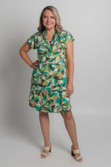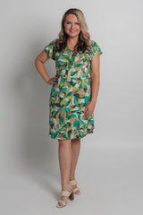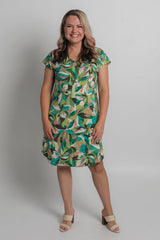 Easy, effortless, and essential - our Pandanus Print short sleeve shift dress is destined to be your go-to outfit for every occasion. It features shades of green with brown, black and cream in a stylish leafy pattern. Made from a soft, jersey fabric for breathability and comfort, this printed knee length dress is hand-tailored with an a-line silhouette, curved hem, and features flattering cap sleeves that never restrict your arms or hold in heat. Add sneakers or sandals for a fun daytime look or dress it up for evenings or special events.