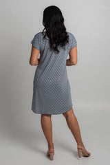 Easy, effortless, and essential - our Pearl Print short sleeve shift dress is destined to be your go-to outfit for every occasion. It features navy, blue and khaki green colours in a stylish geometric pattern. Made from a soft, jersey fabric for breathability and comfort, this printed knee length dress is hand-tailored with an a-line silhouette, curved hem, and features flattering cap sleeves that never restrict your arms or hold in heat. Add sneakers or sandals for a fun daytime look or dress it up for evenings or special events.