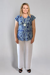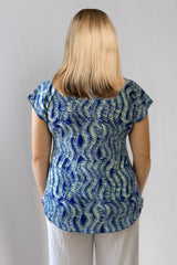 A stylish take on a classic women's tee, the Ripple Print short sleeve shirt is designed to freshen up your wardrobe. This gorgeous print features blue tones in a stylish pattern. Made with a soft jersey fabric, our Ripple top is tailored with a figure-flattering swing cut, curved hemline, and a cap sleeve to ensure you feel cool and comfortable all day long. We love the way this flattering v-neck top looks paired with palazzo pants, capris, or your favourite pair of denim jeans. Plus, it's versatile enough to wear for work, travel, or every day.