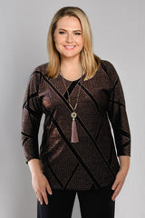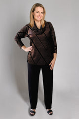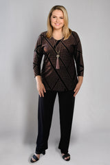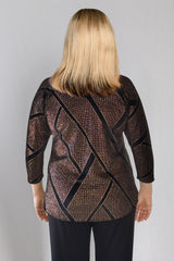 Upgrade your special occasion style with this 3/4 sleeve top which features our Rumba sparkle print fabric, new to our Glitz and Glam collection. This gorgeous print combines a black background with copper metallic sparkle print in a geometric pattern. Designed using a soft and breathable jersey knit fabric for a comfortable fit, this women print top is easy to wear with palazzo pants. You'll love the fit of the magyar cut sleeve, attractive v neck and curved hemline— it’s the perfect top for your next special occasion!