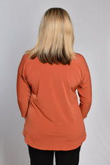 Upgrade your casual style with this 3/4 sleeve top in Rust. Designed using a lightweight microfibre jersey for superior softness. This women's top is relaxed and comfortable fit, making it easy to wear with palazzo pants, jeans, leggings, or a classic capri. You'll love the fit of the magyar cut sleeve, attractive v neck and curved hemline— it’s the perfect top for creating fashionable layers this season!