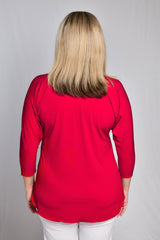 Upgrade your casual style with this 3/4 sleeve top in Sassy red. Designed using a lightweight jersey fabric for superior softness. This women's top is relaxed and comfortable fit, making it easy to wear with palazzo pants, jeans, leggings, or a classic capri. You'll love the fit of the magyar cut sleeve, attractive v neck and curved hemline— it’s the perfect top for creating fashionable layers this season!