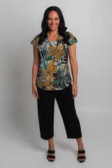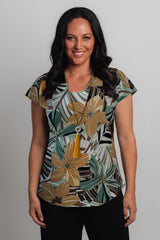 A stylish take on a classic women's tee, the Sunflower Print short sleeve shirt is designed to freshen up your wardrobe. This gorgeous print combines green shades with brown, mustard and white in a stylish floral pattern. Made with a soft jersey fabric, our Sunflower top is tailored with a figure-flattering swing cut, curved hemline, and a cap sleeve to ensure you feel cool and comfortable all day long. We love the way this flattering v-neck top looks paired with palazzo pants, capris, or your favourite pair of denim jeans. Plus, it's versatile enough to wear for work, travel, or every day.