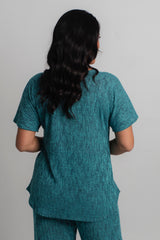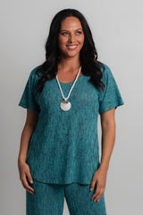 Upgrade your casual style with this flowy feminine knit top. Designed using a soft and breathable poly/rayon fabric for a relaxed and comfortable fit, this woman’s top is perfect to wear with our matching palazzo pants for an elegant dressy pantsuit. You'll love the fit of the seamless elbow length sleeve, flattering round neck, and curved hemline. For a trendy casual look, wear over your favourite jeans, a pair of our colourful capris or our print palazzo pants. This is a stylish top to transition from one season to the next!