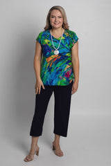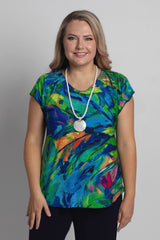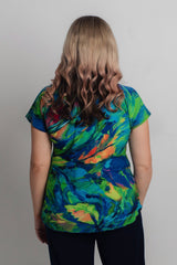 A stylish take on a classic women's tee, the Tsunami Print short sleeve shirt is designed to freshen up your wardrobe. This gorgeous print features bold green, blue, orange and pink colours in a stylish painterly pattern. Made with a soft jersey fabric, our Tsunami top is tailored with a figure-flattering swing cut, curved hemline, and a cap sleeve to ensure you feel cool and comfortable all day long. We love the way this flattering v-neck top looks paired with palazzo pants, capris, or your favourite pair of denim jeans. Plus, it's versatile enough to wear for work, travel, or every day.