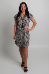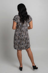 Easy, effortless, and essential - our Wiggles Print short sleeve shift dress is destined to be your go-to outfit for every occasion. It features black, white and tan colours in a stylish zebra-print pattern. Made from a soft, jersey fabric for breathability and comfort, this printed knee length dress is hand-tailored with an a-line silhouette, curved hem, and features flattering cap sleeves that never restrict your arms or hold in heat. Add sneakers or sandals for a fun daytime look or dress it up for evenings or special events.